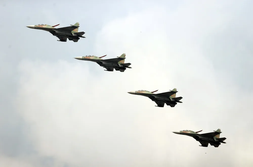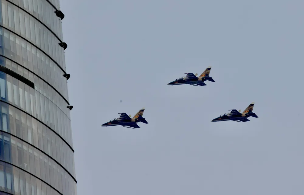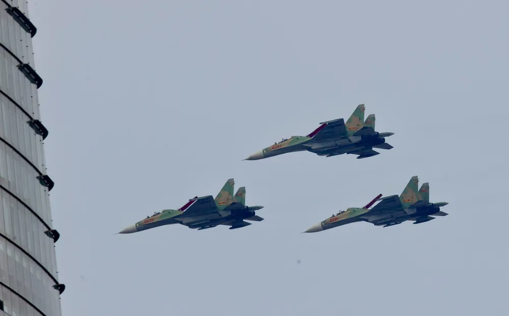 Trong không khí trang nghiêm và hào hùng ấy, dàn chiến đấu cơ Su-30MK2 và Yak-130 cũng đồng loạt xuất kích, thực hiện nhiều động tác kỹ thuật phức tạp, đẹp mắt, thu hút ánh nhìn và sự cổ vũ của đông đảo người dân thành phố.