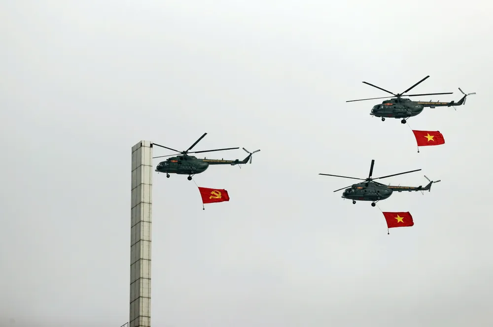 Đây là lần thứ 3, phi đội trực thăng của Quân chủng Phòng không - không quân bay diễn tập trên bầu trời TPHCM, nhưng là lần đầu tiên thực hiện bay kéo cờ. Quả đối trọng 120kg được cố định dưới cờ để giữ căng dây cờ trong quá trình bay.