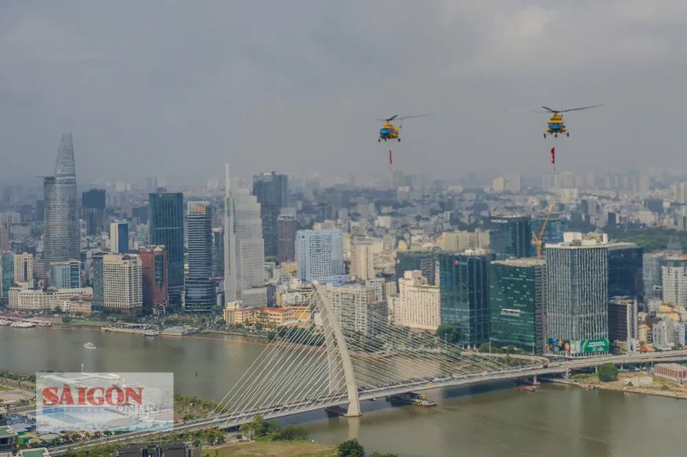 Trực thăng kéo cờ bay ngang các tòa nhà cao tầng tại TPHCM. Ảnh: DŨNG PHƯƠNG