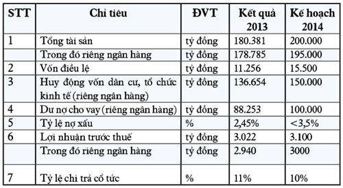 Năm 2014 được dự báo còn nhiều khó khăn. Mục tiêu điều hành của Chính phủ là ưu tiên ổn định kinh tế vĩ mô, kiểm soát lạm phát; định hướng tăng trưởng GDP 5,8%/năm, lạm phát dưới 7%/năm; tiếp tục tái cơ cấu nền kinh tế, tái cơ cấu các DN nhà nước. NHNN thực hiện chính sách tiền tệ chặt chẽ, linh hoạt, kiểm soát lạm phát và hỗ trợ tăng trưởng kinh tế hợp lý; định hướng tổng phương tiện thanh toán tăng 16-18%, tăng trưởng tín dụng tăng khoảng 12-14%; giữ ổn định tỷ giá, kiểm soát giá vàng; tái cơ cấu các tổ chức tín dụng, tập trung xử lý nợ xấu.