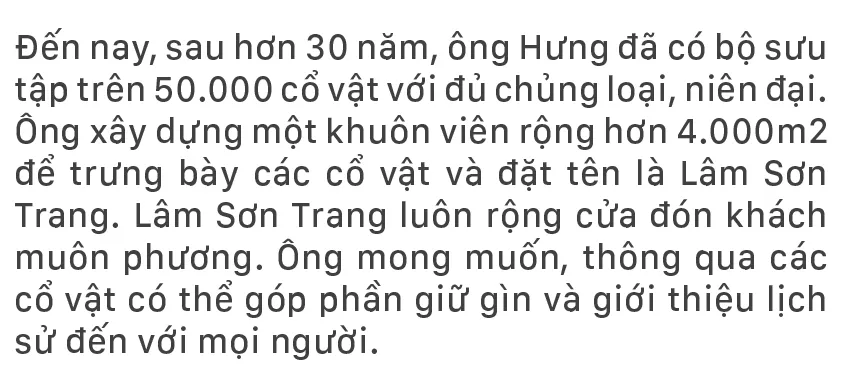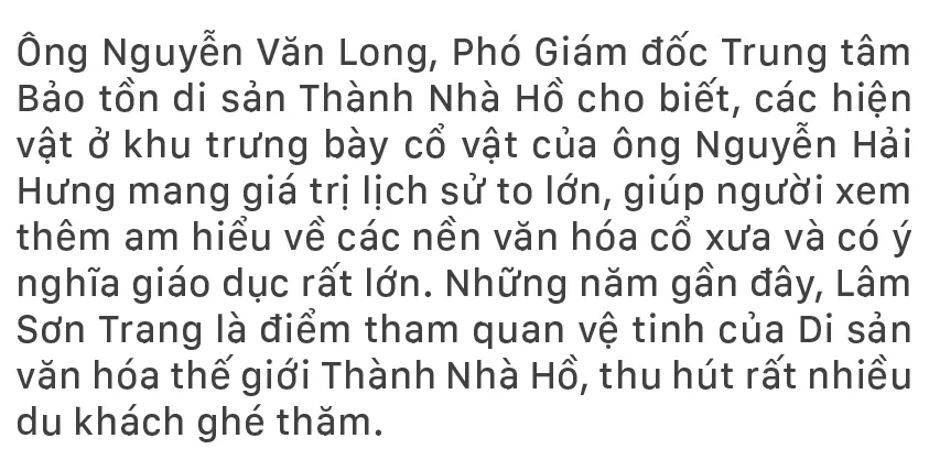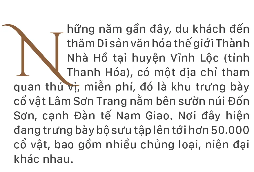 (ĐTTCO) - Những năm gần đây, du khách đến thăm Di sản văn hóa thế giới Thành Nhà Hồ tại huyện Vĩnh Lộc (tỉnh Thanh Hóa), có một địa chỉ tham quan thú vị, miễn phí, đó là khu trưng bày cổ vật Lâm Sơn Trang nằm bên sườn núi Đốn Sơn, cạnh Đàn tế Nam Giao. Nơi đây hiện đang trưng bày bộ sưu tập lên tới hơn 50.000 cổ vật, bao gồm nhiều chủng loại, niên đại khác nhau.
