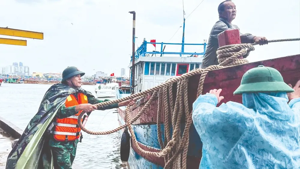 Các lực lượng chức năng hỗ trợ tàu cá neo đậu an toàn ở âu thuyền Thọ Quang (TP Đà Nẵng), hạn chế va đập khi bão đổ bộ. Ảnh: XUÂN QUỲNH