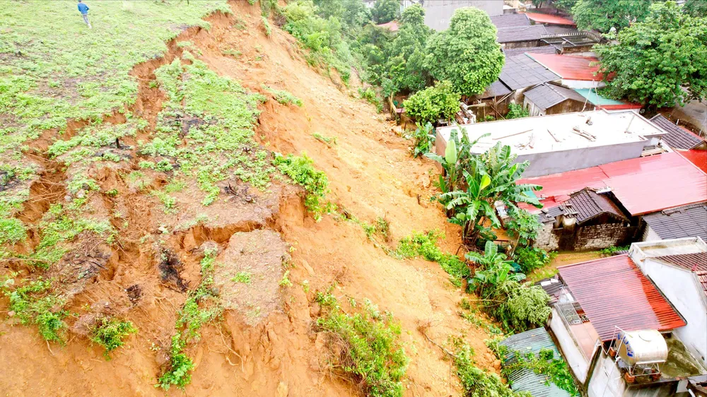 Mưa lớn kéo dài thời gian qua đã khiến đồi bị nứt, sạt, đe dọa trực tiếp 25 nhà dân ngay phía dưới.
