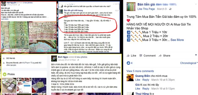 Những facebook công khai rao bán tiền giả.