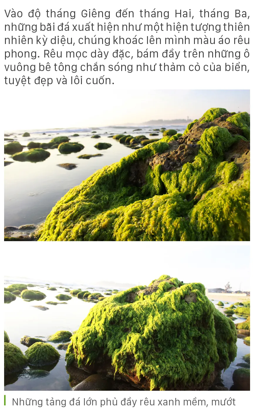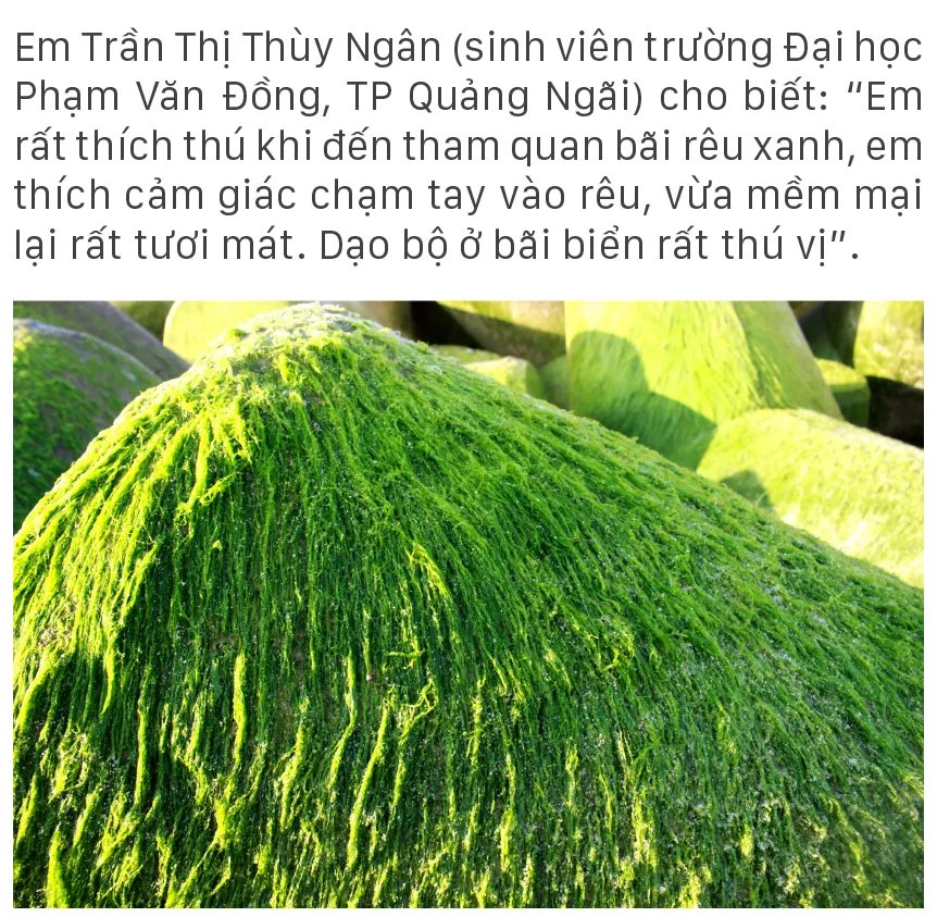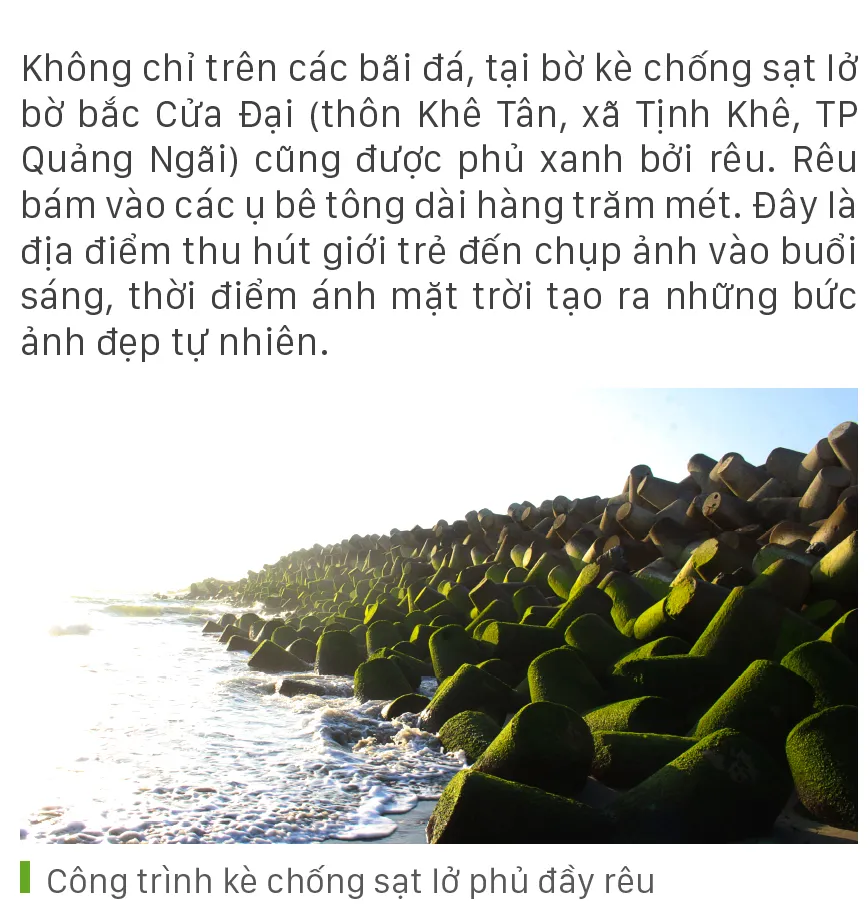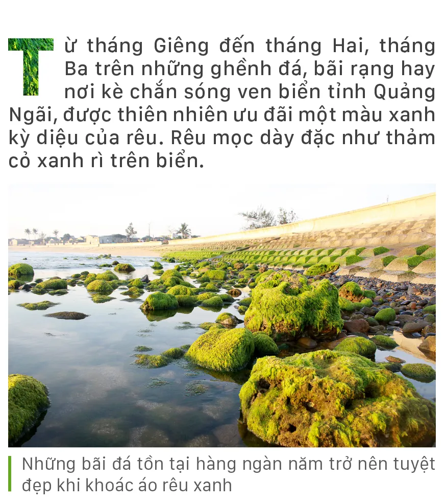 (ĐTTCO) - Từ tháng Giêng đến tháng Hai, tháng Ba trên những ghềnh đá, bãi rạng hay nơi kè chắn sóng ven biển tỉnh Quảng Ngãi, được thiên nhiên ưu đãi một màu xanh kỳ diệu của rêu. Rêu mọc dày đặc như thảm cỏ xanh rì trên biển.