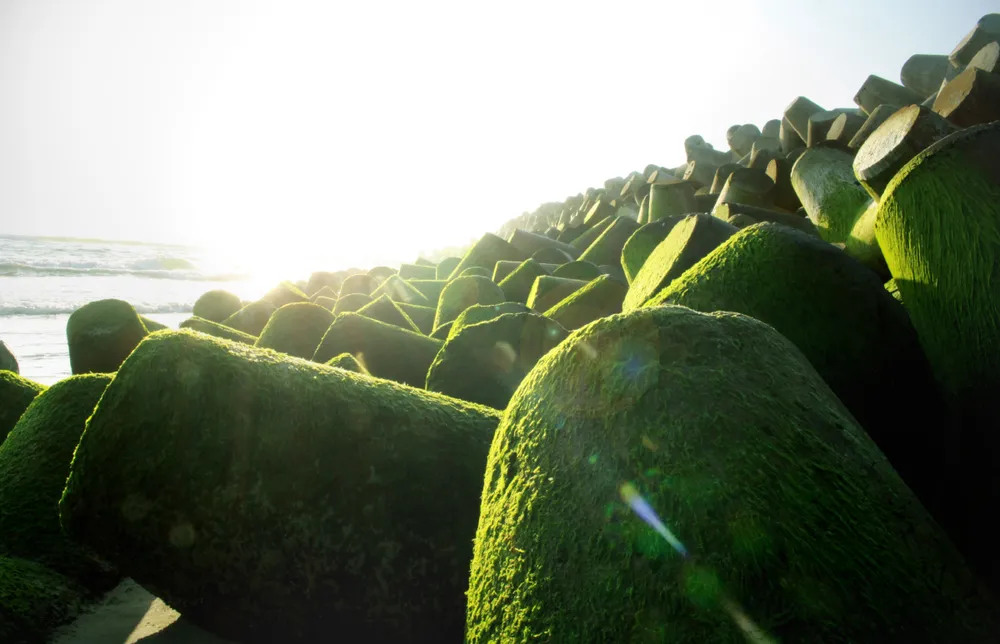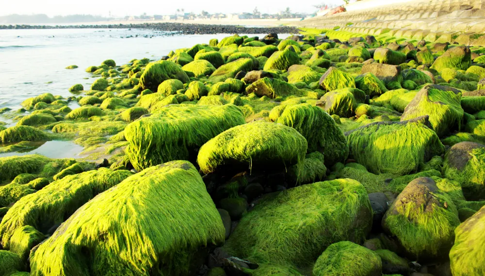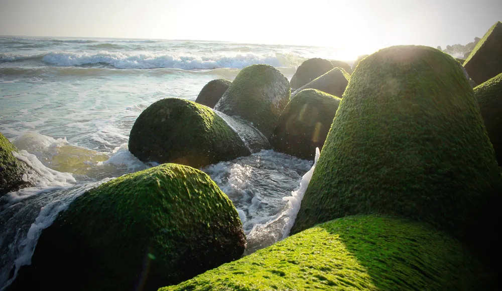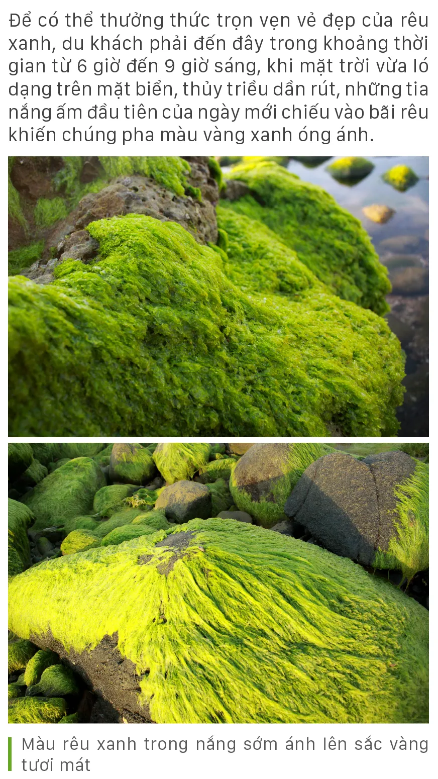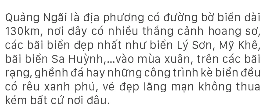 (ĐTTCO) - Từ tháng Giêng đến tháng Hai, tháng Ba trên những ghềnh đá, bãi rạng hay nơi kè chắn sóng ven biển tỉnh Quảng Ngãi, được thiên nhiên ưu đãi một màu xanh kỳ diệu của rêu. Rêu mọc dày đặc như thảm cỏ xanh rì trên biển.