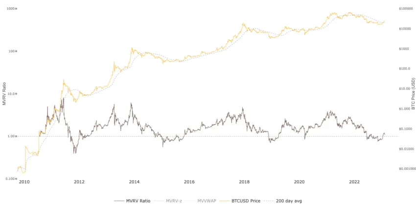 MVRV là viết tắt của tỷ lệ Giá trị thị trường trên Giá trị thực, một chỉ số Bitcoin dài hạn. Nó ước tính thời điểm giá BTC thấp hơn “giá trị hợp lý”. Công cụ phái sinh MVRV Z-Score được sử dụng để xác định xem Bitcoin ở trạng thái định giá quá cao hay thấp so với “giá trị hợp lý”, có tính đến độ lệch chuẩn của tất cả dữ liệu vốn hóa thị trường lịch sử.