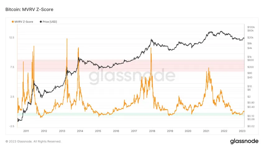 Trong lịch sử, khi MVRV Z-Score nằm trong vùng màu xanh, nó báo hiệu giai đoạn giá Bitcoin chạm đáy. Ngược lại, khi chỉ báo nằm trong vùng màu đỏ, nó báo hiệu thời kỳ quá mua và đỉnh sắp xảy ra trên thị trường BTC.
