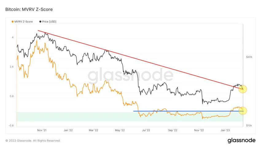 Tuy nhiên, với việc giá BTC breakout đường kháng cự logarit dài hạn (màu đỏ) kể từ mức cao nhất mọi thời đại 69.000 USD đạt được vào ngày 10-11-2021 và MVRV Z-Score hướng đến retest vùng quá bán (đường màu xanh lam), cả hai sự kiện có thể xảy ra đồng thời, cung cấp bằng chứng mạnh mẽ cho việc nối lại thị trường bò.