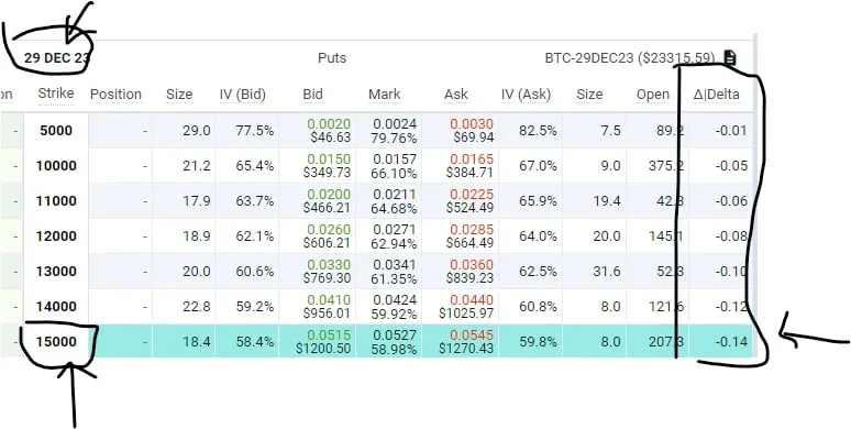 Delta là thước đo thay đổi giá của quyền chọn so với thay đổi giá của tài sản cơ bản. Đối với trường hợp này, delta thấp cho thấy độ nhạy thấp hơn của giá quyền chọn so với những thay đổi giá Bitcoin, ngụ ý rủi ro thấp hơn.