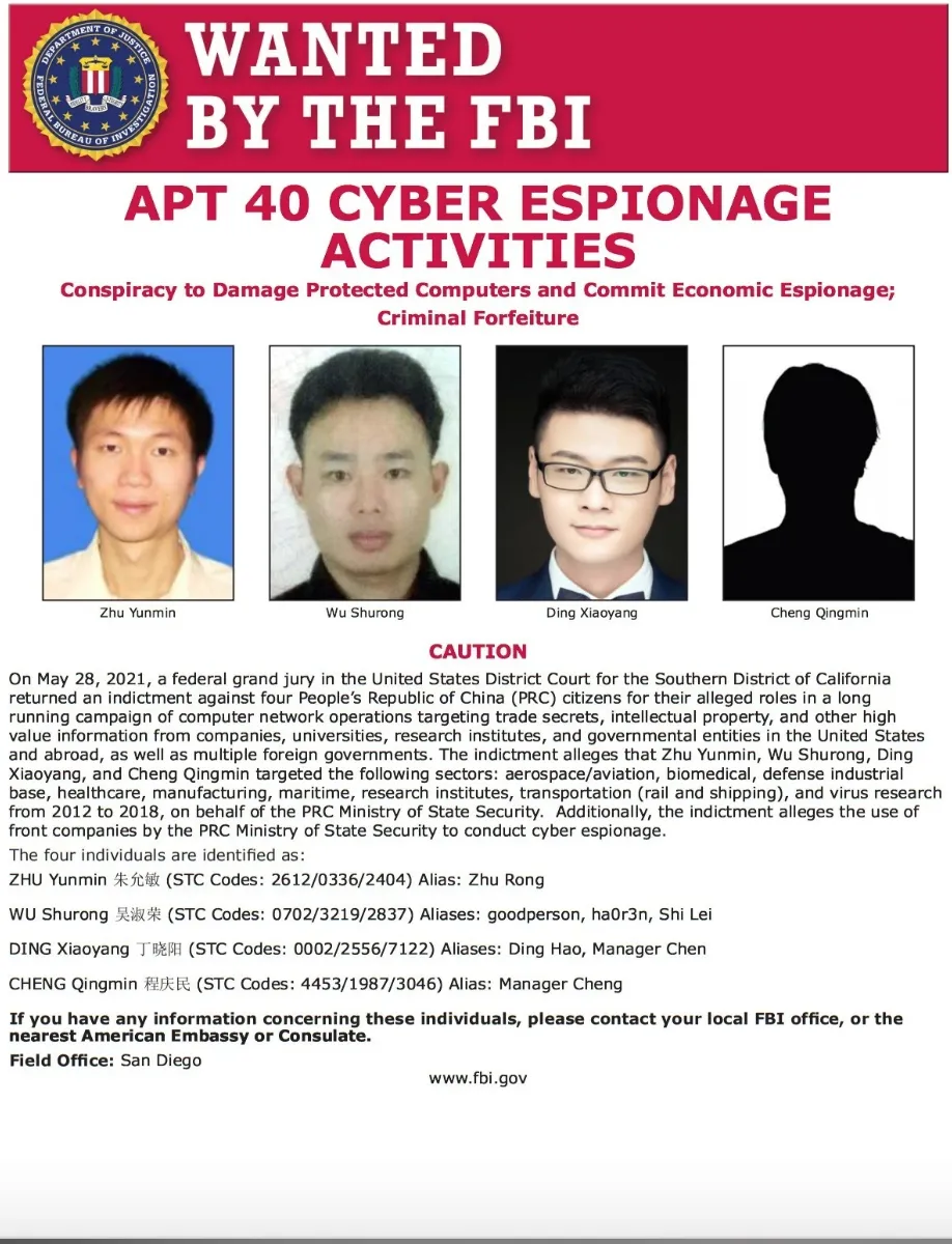 Riêng Bộ Tư pháp Hoa Kỳ cho biết họ đã buộc tội 4 người Trung Quốc đại lục thành lập công ty bình phong, Hainan Xiandun Technology Development, một doanh nghiệp hiện đã tan rã, được cho là đã làm việc với Sở An ninh Nhà nước Hải Nam (HSSD) để thực hiện các âm mưu gián điệp mạng nhắm vào người dùng tại 12 quốc gia bao gồm Mỹ, Anh, Canada, Indonesia, Malaysia và Ả Rập Saudi.