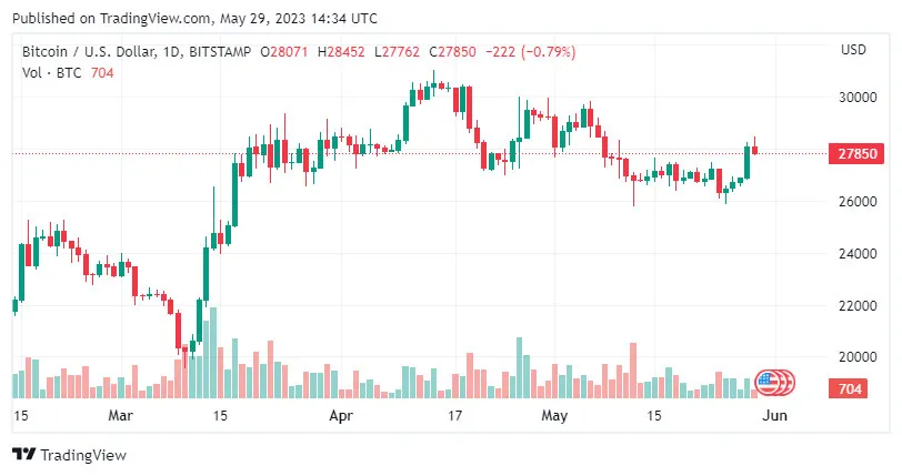 Bitcoin (BTC) đã tăng trên 28.000 USD vào đầu tuần, khi thị trường tiền điện tử phản ứng với một thỏa thuận rõ ràng nhằm tăng trần nợ của Hoa Kỳ.