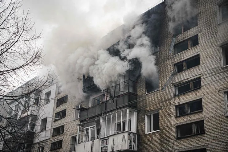 Khói bốc lên từ một tòa nhà dân cư sau cuộc tấn công bằng tên lửa ở Sumy, đông bắc Ukraine, ngày 24 tháng 3, trong bối cảnh Nga xâm lược Ukraine. AFP-Yonhap