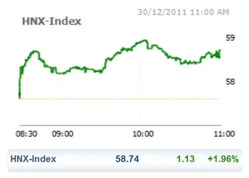 Sắc xanh cũng quay lại với sàn HNX trong phiên giao dịch cuối năm. Chốt phiên, HNX Index tăng mạnh 1,13 điểm (1,96%) lên mức 58,74 điểm.