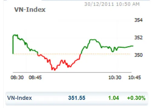 Chốt phiên cuối cùng của năm 2011 hôm nay 30-12, VN Index tăng nhẹ 1,04 điểm (0,3%) lên mức 351,55 điểm.
