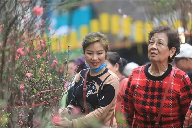 Người dân chọn mua cành đào tại chợ hoa Hàng Lược. (Ảnh: Thanh Tùng/TTXVN)