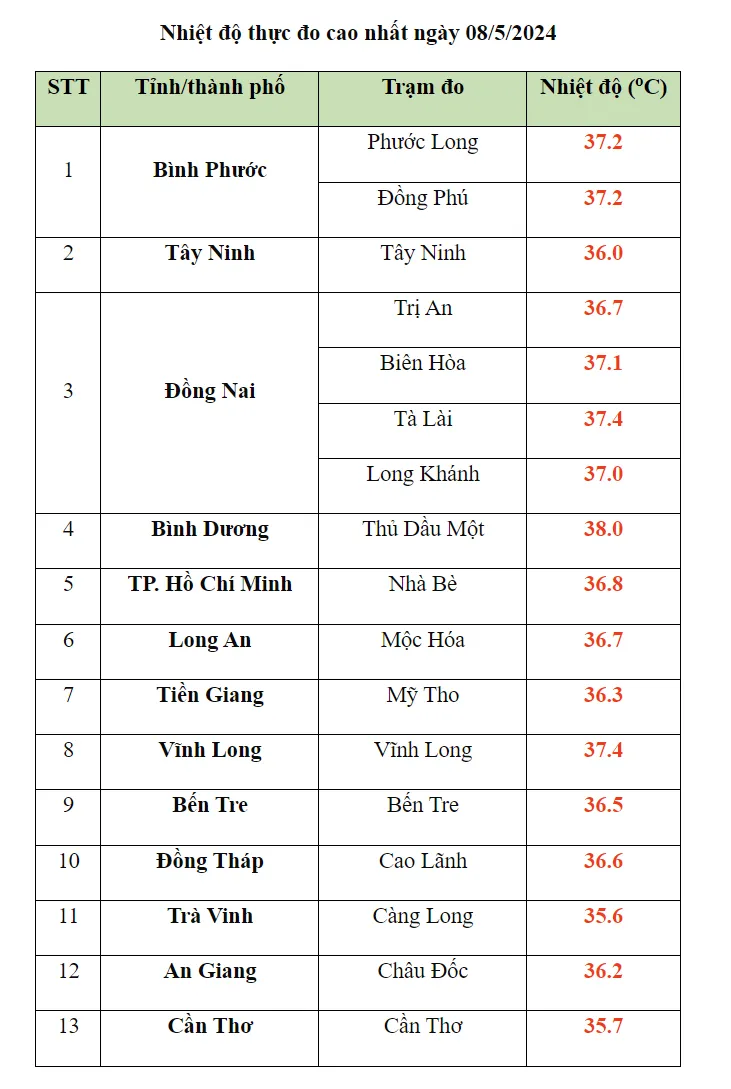 Theo Trung tâm Dự báo khí tượng thủy văn quốc gia, trong 24 giờ qua, ngày 8-5, ở Nam bộ có nắng nóng với nhiệt độ cao nhất phổ biến 35-370C, có nơi trên 370C, như: Phước Long (Bình Phước) 37,20C, Tà Lài (Đồng Nai) 37,40C, Thủ Dầu Một (Bình Dương) 380C, Vĩnh Long 37,40C...; độ ẩm tương đối thấp nhất phổ biến 45-50%.