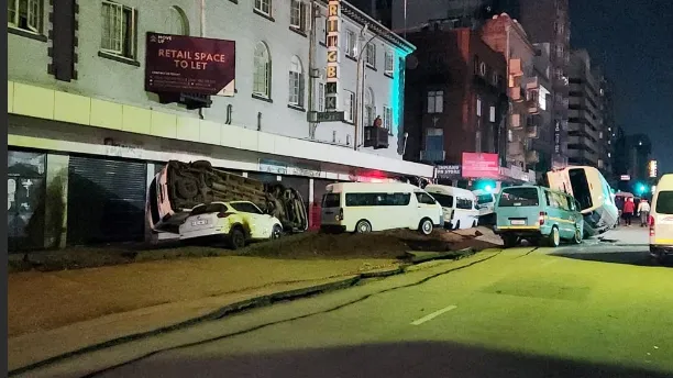 Hình ảnh từ hiện trường cho thấy một con đường bị hư hại nghiêm trọng, nhựa đường bị xé toạc, ô tô và taxi nằm rải rác dọc theo một trong những tuyến giao thông chính của Johannesburg.