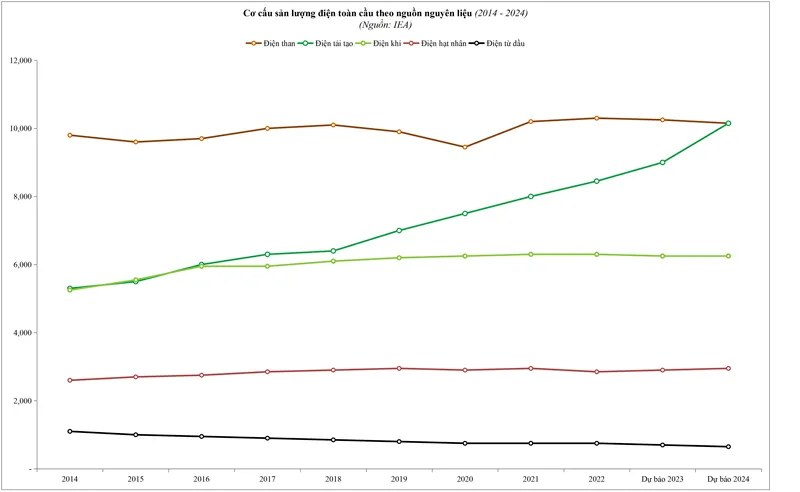Trong khi sản lượng điện từ than hầu như chỉ đi ngang kể từ năm 2014 đến nay, thì quy mô của sản lượng điện tái tạo đã tăng trưởng liên tục với tốc độ tăng trưởng trung bình 5 năm từ 2014-2019 là 5,8%. Kể từ 2020-2024, tốc độ tăng trưởng trung bình của điện tái tạo tăng lên thành 7,7%, trong đó năm 2024 được dự báo tốc độ tăng trưởng lên tới 12,8%.