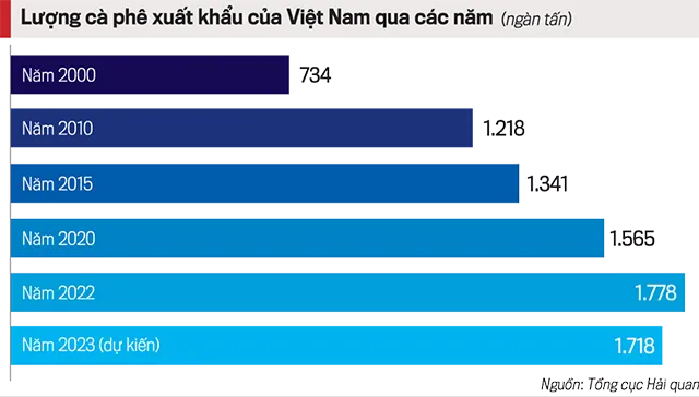 Lượng cà phê xuất khẩu tăng mạnh, nếu năm 2000 đạt 734.000 tấn, thì đến năm 2010 đã đạt 1,218 triệu tấn, năm 2015 đạt 1,341 triệu tấn, năm 2020 đạt 1,565 triệu tấn và năm 2022 đạt 1,778 triệu tấn. Đặc biệt, năm 2022 là một năm rất thành công đối với hoạt động xuất khẩu cà phê của Việt Nam, với lượng xuất khẩu 1,78 triệu tấn và kim ngạch đạt kỷ lục 4,06 tỷ USD.