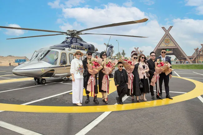 Ông Huy Cận - CEO SixDo (đứng thứ hai từ bên phải) cùng những vị khách đầu tiên đến NovaWorld Ho Tram bằng trực thăng