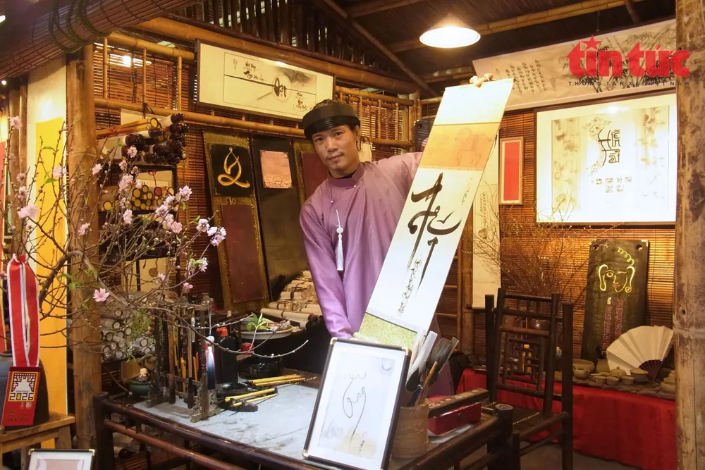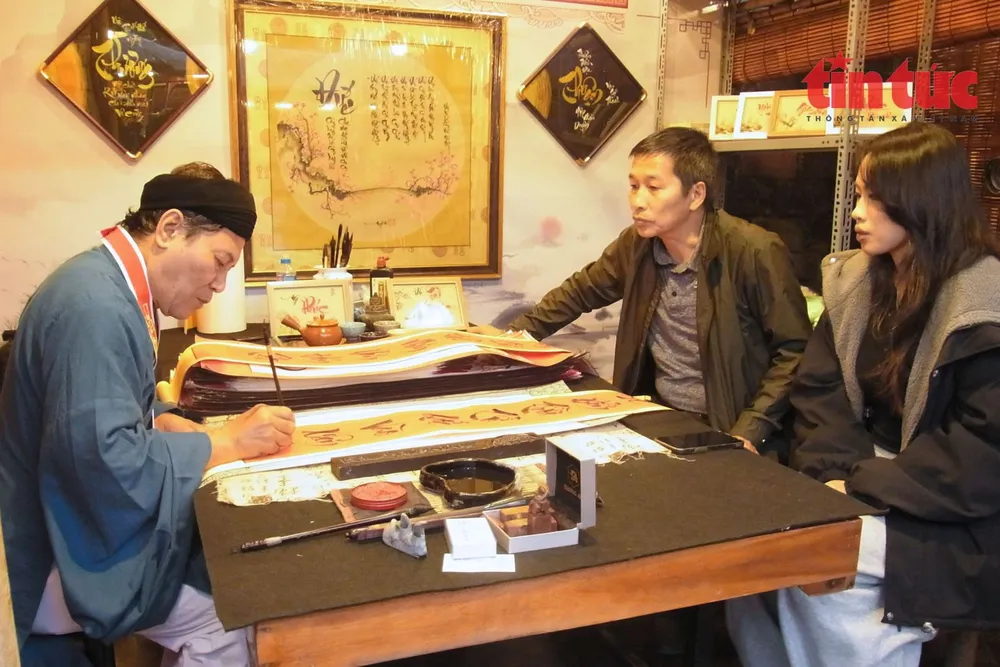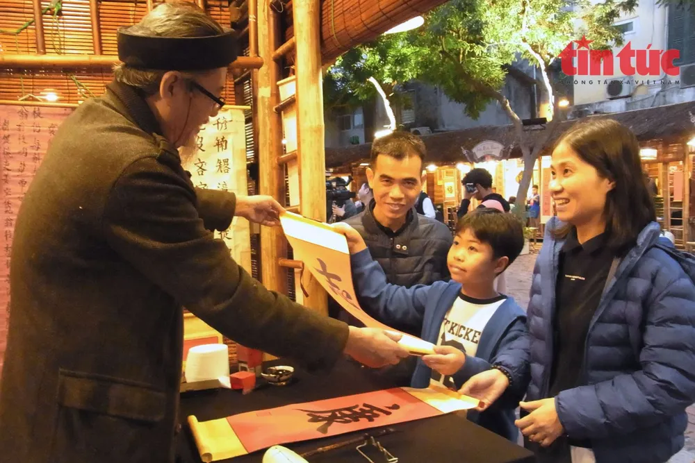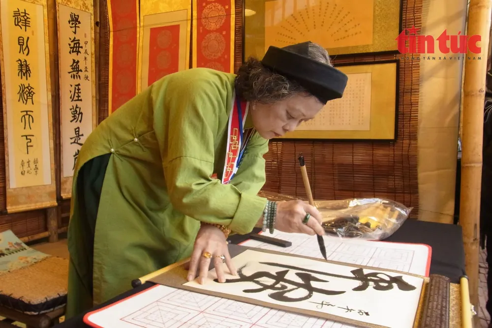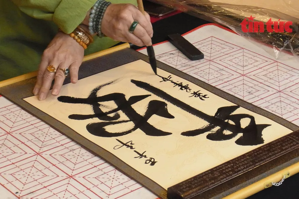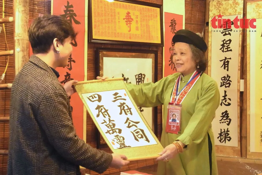 Tại một gian lều thư pháp, bà Hoàng Anh Diệp, Phó Chủ nhiệm Câu lạc bộ Thư họa UNESCO, đang tỉ mẩn hoàn thiện hai chữ “Bình An” bằng mực tàu trên nền giấy đỏ. Vốn là một giáo viên dạy văn có niềm đam mê lớn với chữ Hán, dù đã nghỉ hưu nhưng bà vẫn duy trì công việc cho chữ mỗi dịp xuân về. Bà Diệp chia sẻ, phần lớn mọi người tìm đến thường xin những chữ cầu mong sự an yên, hòa hợp cho gia đình, mong sao cho con cháu được sum vầy, yên ấm. Bà lấy làm hạnh phúc khi thấy nhiều học sinh, nhất là những em chuẩn bị bước vào kỳ thi lớp 9 lên 10 hay thi đại học, vẫn tìm đến mình để xin chữ.
