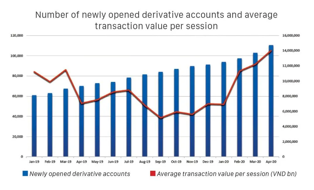 For the derivative market, the liquidity and the number of new accounts also increased sharply. Statistics show that the nominal trading value of this market is reaching a historical peak since the opening of the market with an average of two weeks in May with around VND 17,000 bn per day, while average of April 2020 reached around VND14,000 bn. The peak was on 13 May with the nominal value of VND 21,163 bn. The number of derivative accounts at end of April 2020 reached 110,458 accounts, 1.8 times that in January 2019.