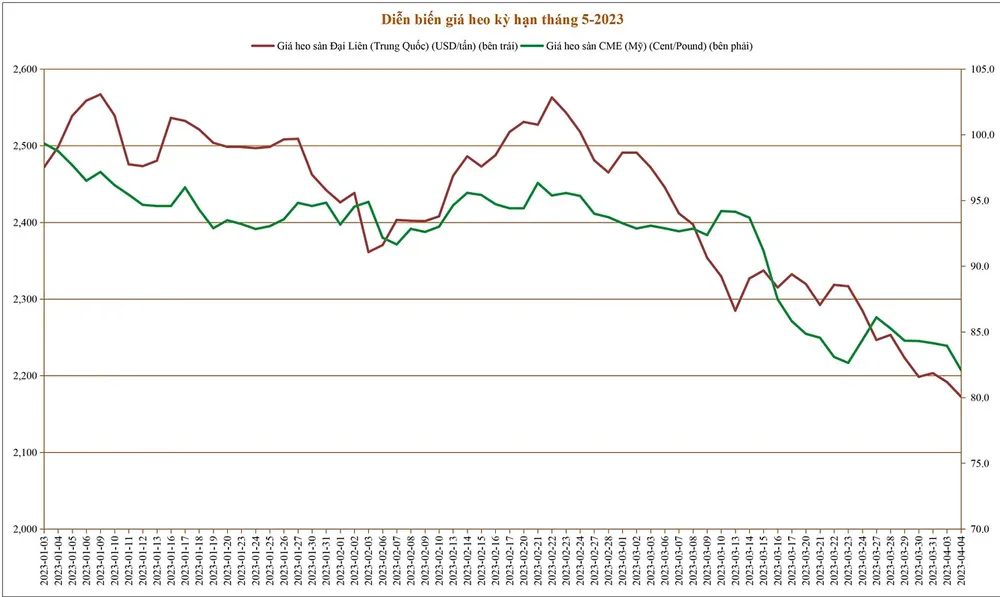 Tính tới ngày 4-4, giá heo kỳ hạn tháng 5 trên sàn Đại Liên giao dịch quanh mức 2.173USD/tấn, tương ứng giảm gần 26% kể từ quý III-2022, giảm 12% kể từ đầu năm 2023. Trong khi đó giá heo trên sàn CME ở Mỹ giao dịch quanh mức 82 cent/pound, giảm hơn 17% kể từ đầu năm.