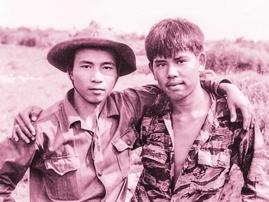 "Hai người lính" - chiến sĩ quân giải phóng Nguyễn Huy Tạo (trái) và người lính Việt Nam cộng hòa Bùi Trọng Nghĩa tại tuyến giáp ranh thôn Long Quang, xã Triệu Trạch, huyện Triệu Phong, tỉnh Quảng Trị tháng 4-1973, và họ gặp lại nhau đầu năm 2018 cũng tại địa điểm năm xưa. Ảnh: Chu Chí Thành |
