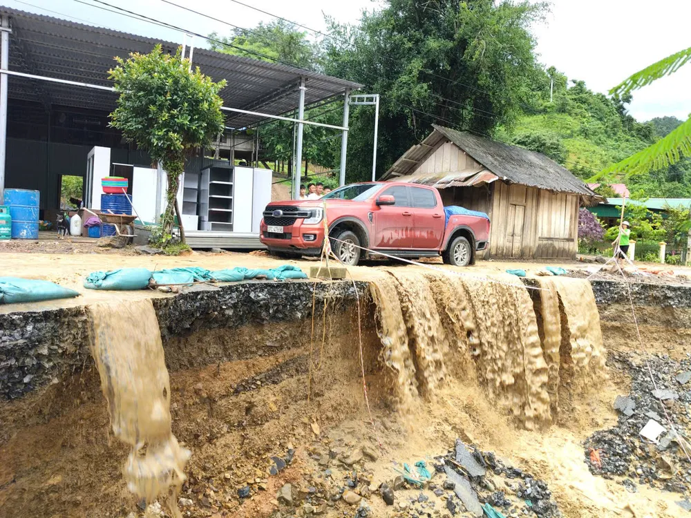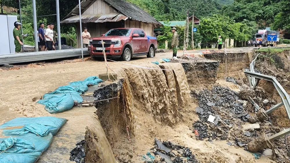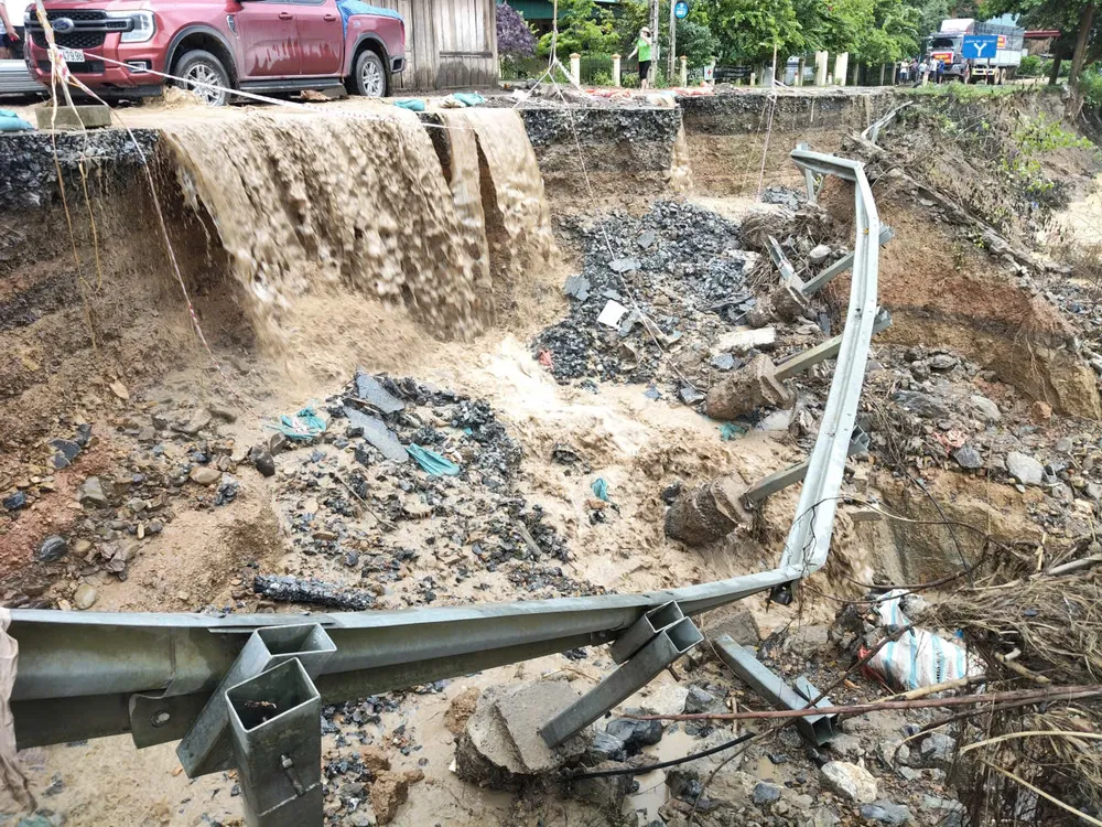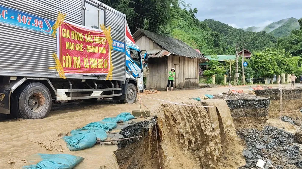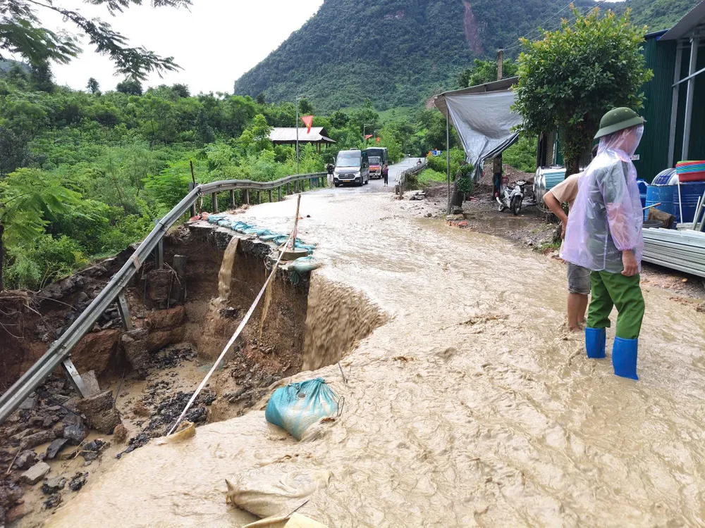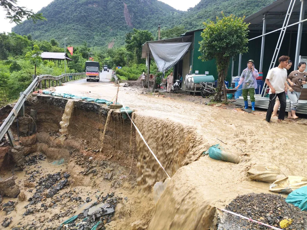 Nhiều đoạn hở hàm ếch nghiêm trọng, nước từ khe núi vẫn không ngừng chảy tràn qua đường khiến điểm sạt lở thêm nghiêm trọng, gây nguy hiểm cho các phương tiện qua lại. Xe hàng cứu trợ vào xã Mỹ Lý và Nhôn Mai - nơi thiệt hại nặng nề sau đợt mưa lũ cuối tháng 7, gặp nhiều khó khăn.