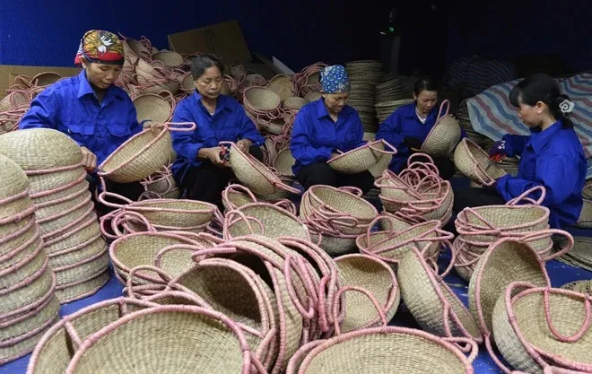 Công nhân Công ty Trách nhiệm Hữu Hạn Xuất khẩu và Đầu tư Thành Hóa làm các mặt hàng thủ công truyền thống. (Ảnh: Minh Đức/TTXVN)