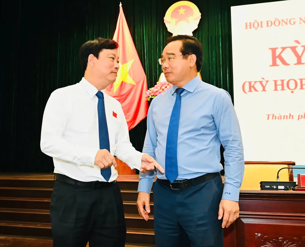 Chủ tịch UBND TPHCM Nguyễn Văn Được trao đổi cùng Chủ tịch HĐND TPHCM Võ Văn Minh tại kỳ họp. Ảnh: VIỆT DŨNG