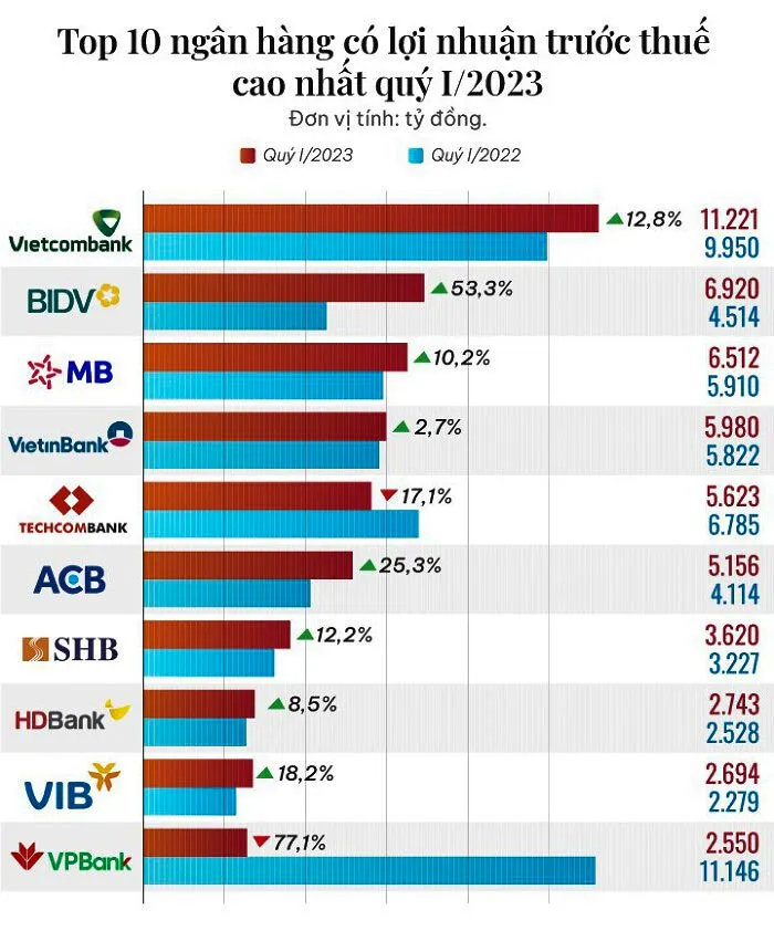 Thống kê cho thấy, trong số 26 DN niêm yết trên thị trường chứng khoán (TTCK) có lợi nhuận từ 1.000 tỷ đồng trở lên, có tới 14 NH. Trong đó, đứng đầu danh sách của ngành NH là VCB (Vietcombank), với lợi nhuận sau thuế quý I đạt 11.221 tỷ đồng.