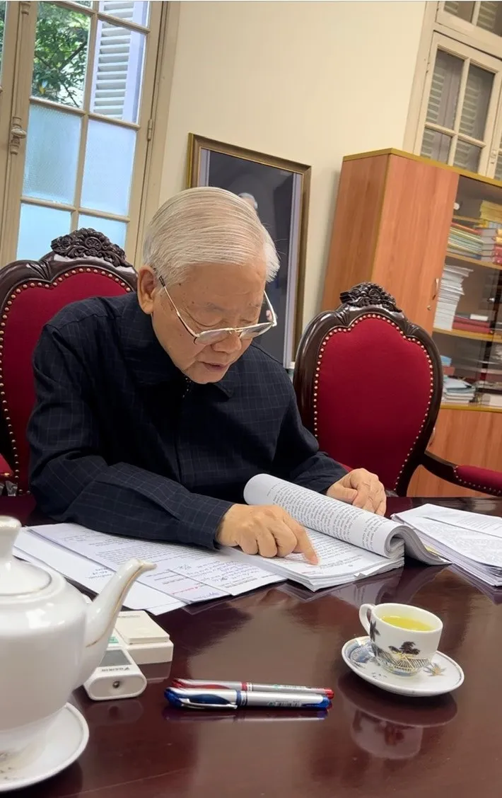 Tổng Bí thư Nguyễn Phú Trọng đọc và sửa bản thảo sách. Ảnh chụp năm 2023