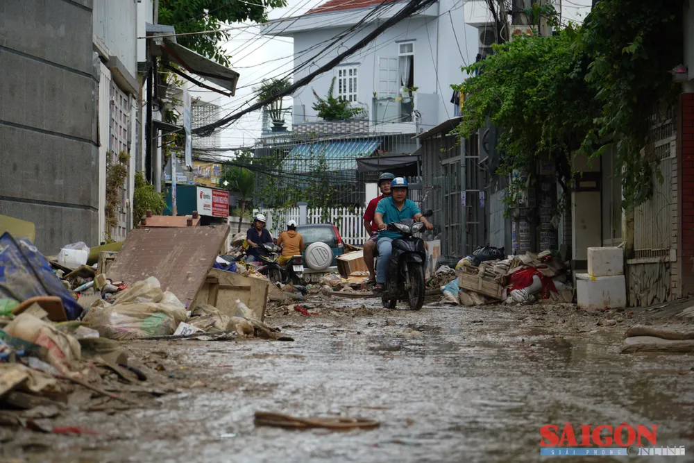 Lũ rút để lộ cảnh hoang tàn, bùn đất ngập ngụa, rác thải phủ kín nhiều tuyến đường