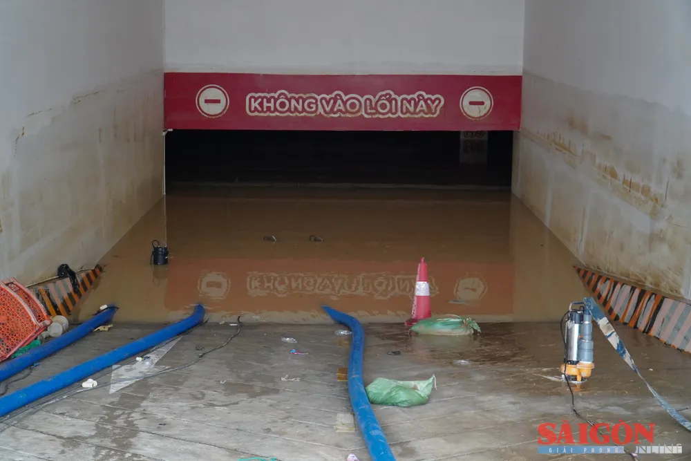 Siêu thị ở phường Tây Nha Trang đang hút nước từ hầm gửi xe, nơi có hơn 100 xe máy của nhân viên đang chìm trong nước
