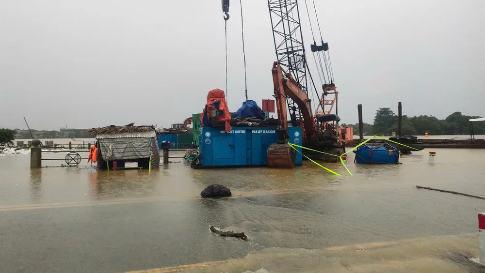 Lũ sông Hương vượt báo động 2 nên lực lượng chức năng phải dựng rào chắn cấm phương tiện lưu thông qua đập đá.