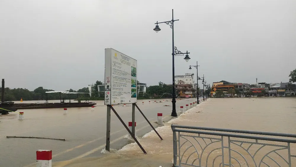 Nước lũ trên các sông dâng cao khiến nhiều nơi ở Huế ngập trong nước. Khu vực Đập Đá (đường Nguyễn Sinh Cung, TP Huế) nước tràn qua đường, lực lượng chức năng phải đặt rào chắn, cấm người dân lưu thông.