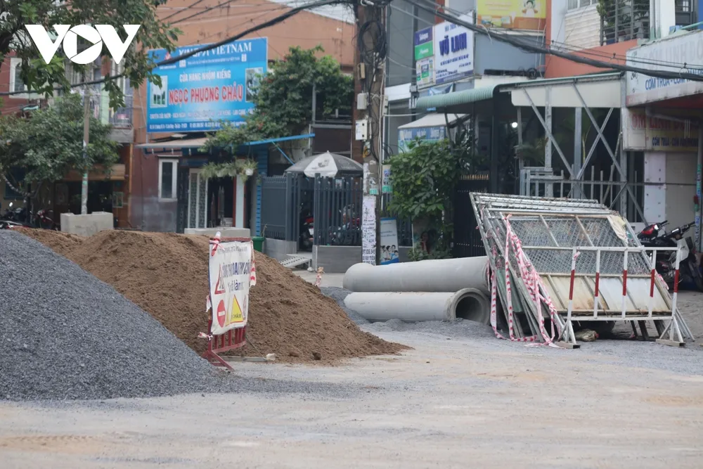 Tại khu vực dự án sửa chữa đường số 10 (phường Linh Đông, TP. Thủ Đức), vật liệu xây dựng được bố trí ngổn ngang.