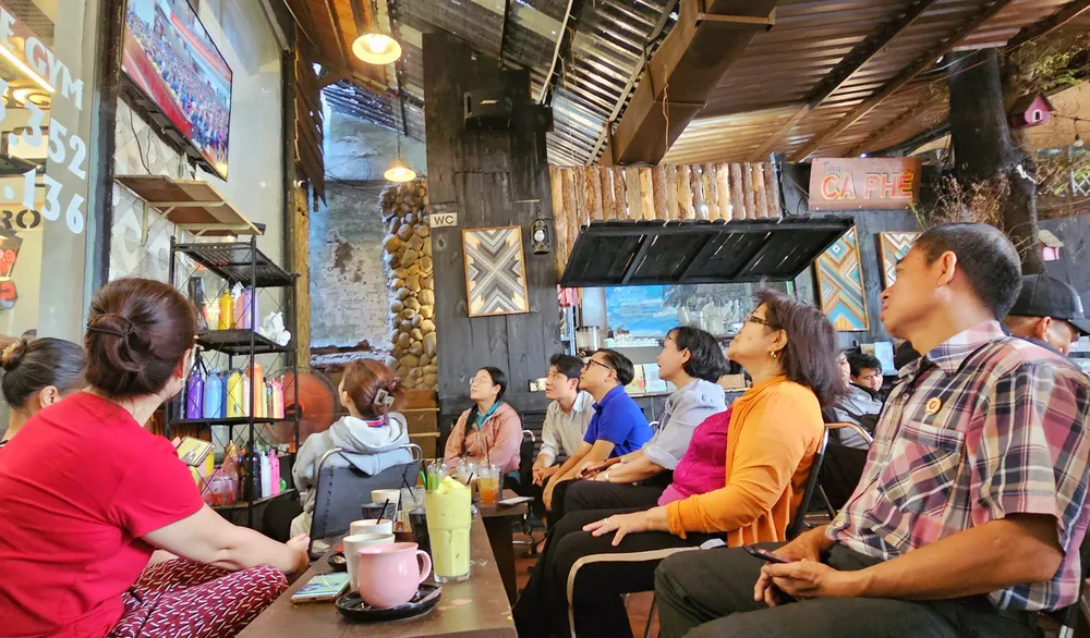 Cán bộ, hội viên, đoàn viên thanh niên phường Bình Thạnh theo dõi đại hội qua truyền hình trực tiếp. Ảnh: MẠNH THẮNG
