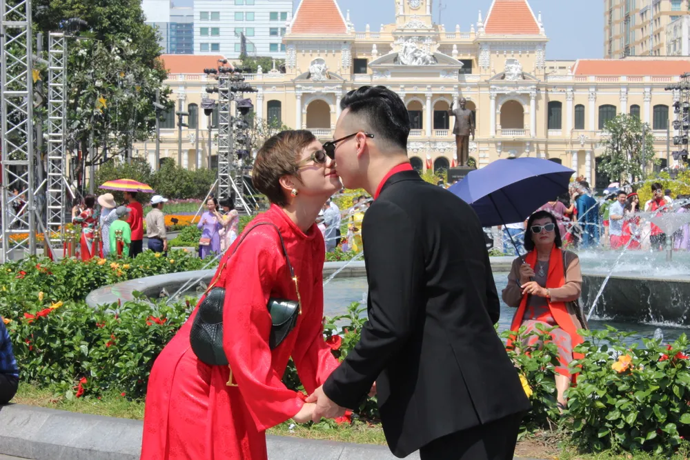 Nhiều đôi bạn trẻ ghi lại tình yêu trong ngày đầu năm. Ảnh: TIỂU TÂN