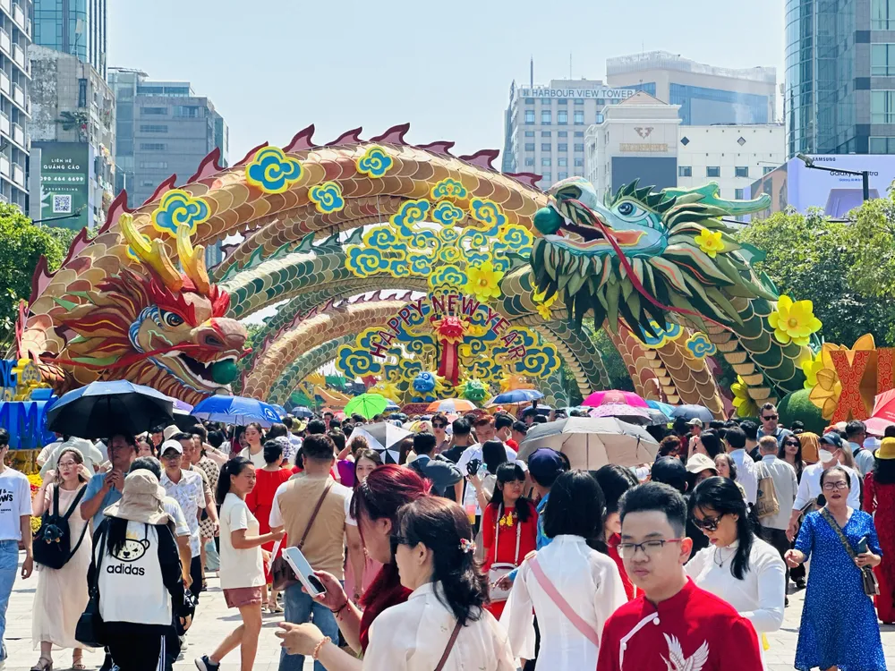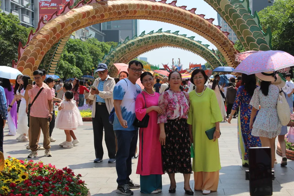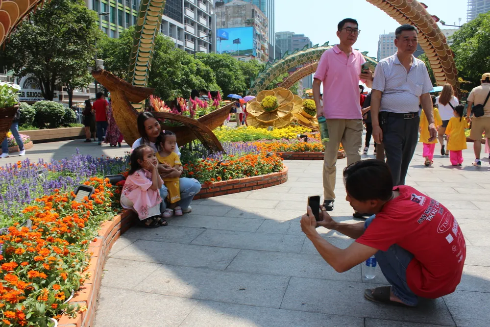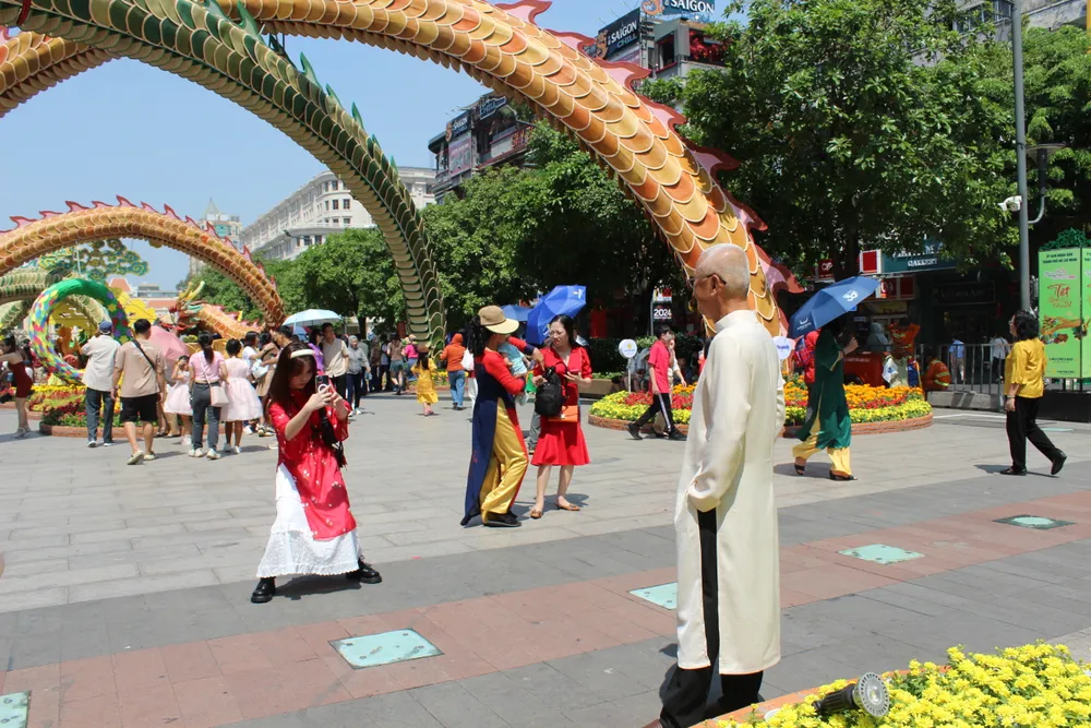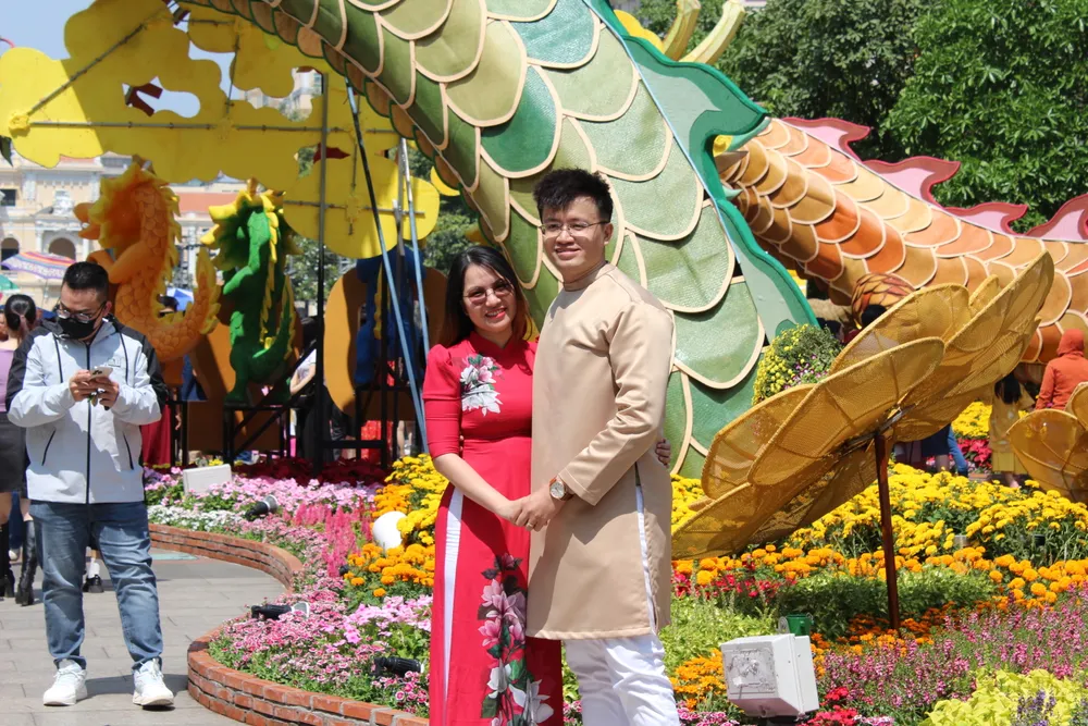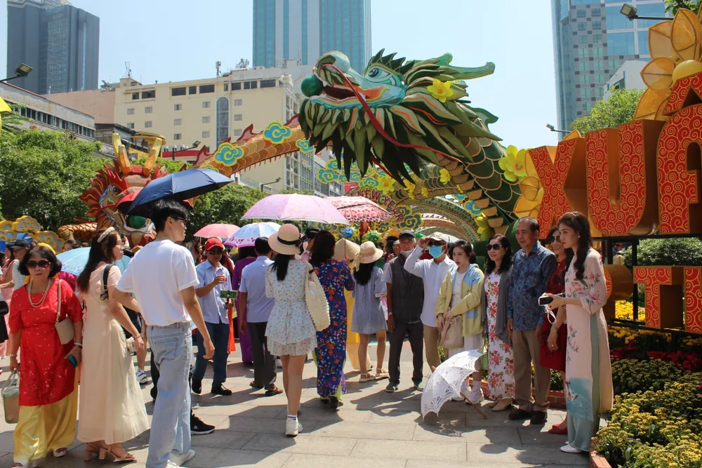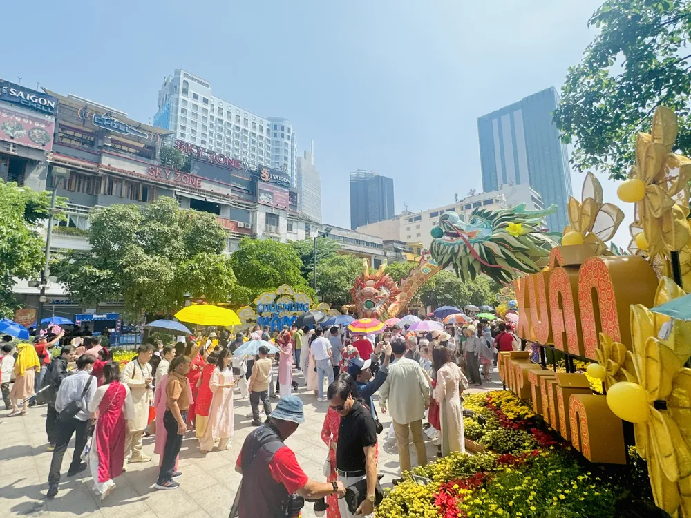 Đường hoa Nguyễn Huệ Tết Giáp Thìn 2024 là điểm nhấn trong không gian văn hóa tết, thu hút đông đảo người dân và du khách trong nước, quốc tế đến tham quan, thưởng ngoạn trong ngày đầu năm mới. Hàng chục ngàn người từ sáng sớm đã tranh thủ “lên đồ”, ghé đường hoa chụp ảnh lưu niệm. Khu vực cổng chào với cặp rồng “Lưỡng Long triều liên" có thể cử động phần đầu thu hút sự thích thú của du khách. Nhiều người phải đứng xếp hàng cũng như cố gắng tìm những vị trí thuận lợi để giữ lại những hình ảnh đẹp với linh vật đường hoa năm nay.