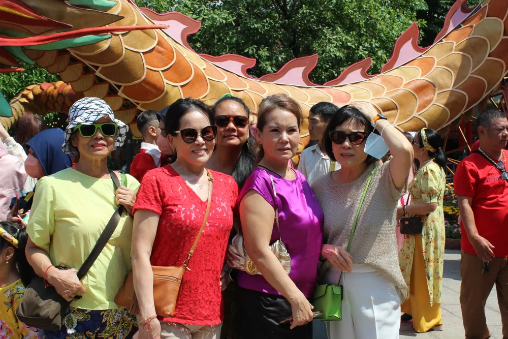 Người dân diện quần áo mới cùng nhau du xuân, chụp hình lưu niệm dưới linh vật đường hoa là cặp rồng Song Long triều liên. Ảnh: TIỂU TÂN