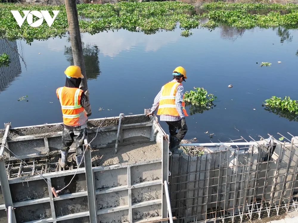 Công nhân xây dựng đang làm việc tại dự án kênh Tham Lương - Bến Cát - rạch Nước Lên (Ảnh: Hoàng Minh)