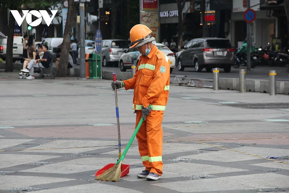 Nắng nóng gay gắt khiến những công nhân vệ sinh thêm vất vả (Ảnh: Hoàng Minh)