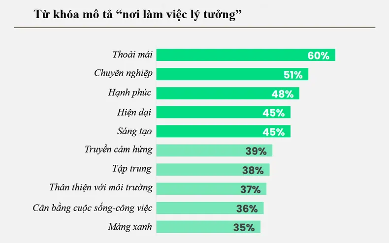 “Thoải mái” cũng là từ khóa đầu tiên người Việt nghĩ đến khi nhắc về chủ đề này. Báo cáo nhận định, điều này cho thấy người lao động mong muốn một nơi làm việc không chỉ thoải mái về thể chất mà còn về tâm lý và sự kích thích về trí tuệ.