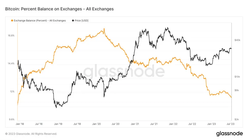 Theo Glassnode, kể từ ngày 10-7, chỉ có 11,59% nguồn cung BTC có sẵn nằm trong các ví sàn giao dịch. Con số này chưa từng thấp như vậy kể từ giữa tháng 12-2017, khi Bitcoin đạt mức cao nhất mọi thời đại trước đó là 20.000 USD.