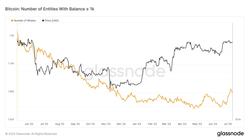 Trong khi đó, việc giảm số dư trên sàn giao dịch tiếp tục diễn ra khi số lượng cá voi Bitcoin tăng lên. Khoảng 40 con cá voi mới đã xuất hiện kể từ cuối tháng 4 và vào ngày 7-7, số lượng của chúng đạt mức cao nhất kể từ cuộc khủng hoảng FTX vào tháng 11-2022.