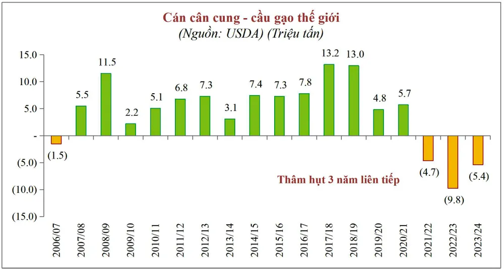 Báo cáo gần nhất trong tháng 10, số liệu của Bộ Nông nghiệp Mỹ cho thấy, sản lượng gạo toàn cầu mùa vụ 2023-2024 dự báo đạt 518 triệu tấn, tăng 4,5 triệu tấn so với mùa vụ trước, tương ứng tăng 0,9%. Tuy nhiên, mức tăng đó không đủ đáp ứng nhu cầu tiêu thụ được dự báo đạt gần 524 triệu tấn.