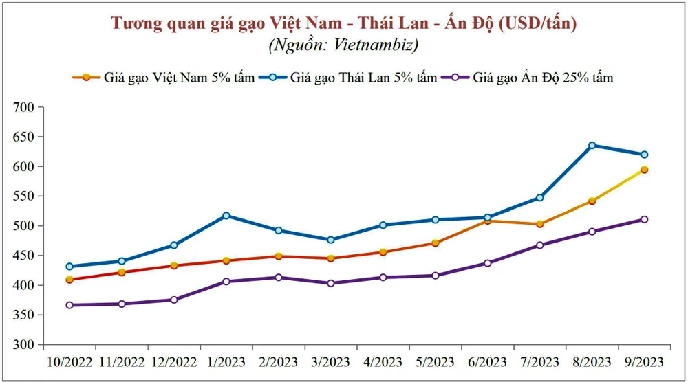 Giá gạo của Việt Nam đã tăng từ mức trung bình 502,8 USD/tấn hồi tháng 7 lên 594,4 USD/tấn trong tháng 9, tương ứng tăng hơn 18%, kể từ khi Ấn Độ đưa ra các biện pháp hạn chế xuất khẩu gạo. So với cùng kỳ năm 2022, giá gạo Việt Nam đã tăng gần 52%.